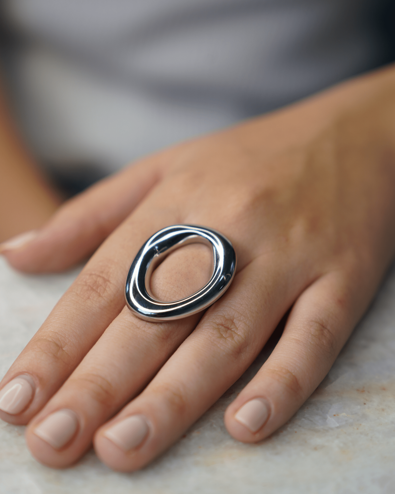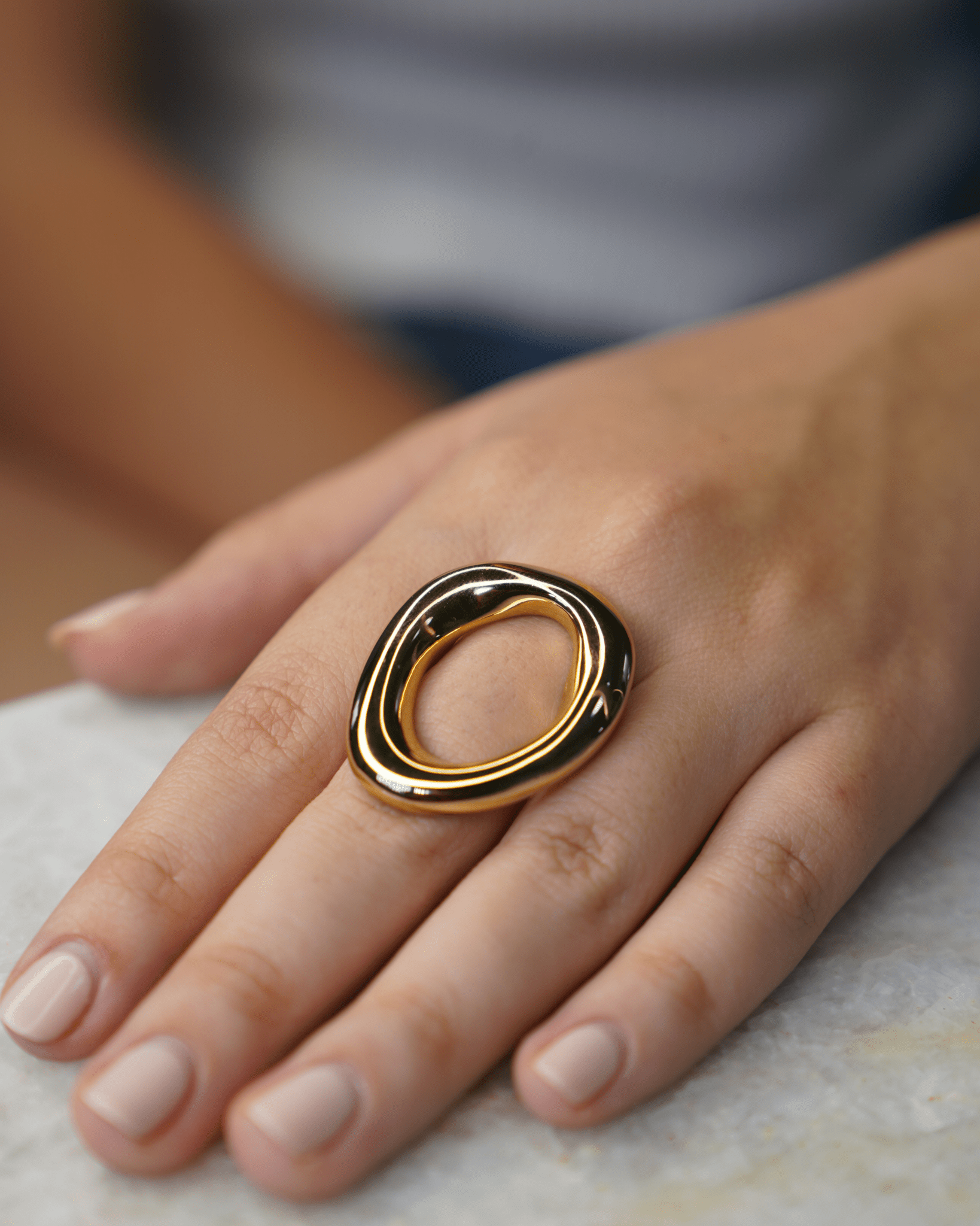 Una pieza statement que habla por sí sola. Este anillo dorado con forma oval irregular está inspirado en el arte contemporáneo y la fuerza de lo orgánico. Perfecto para llevar solo y dejar que brille.