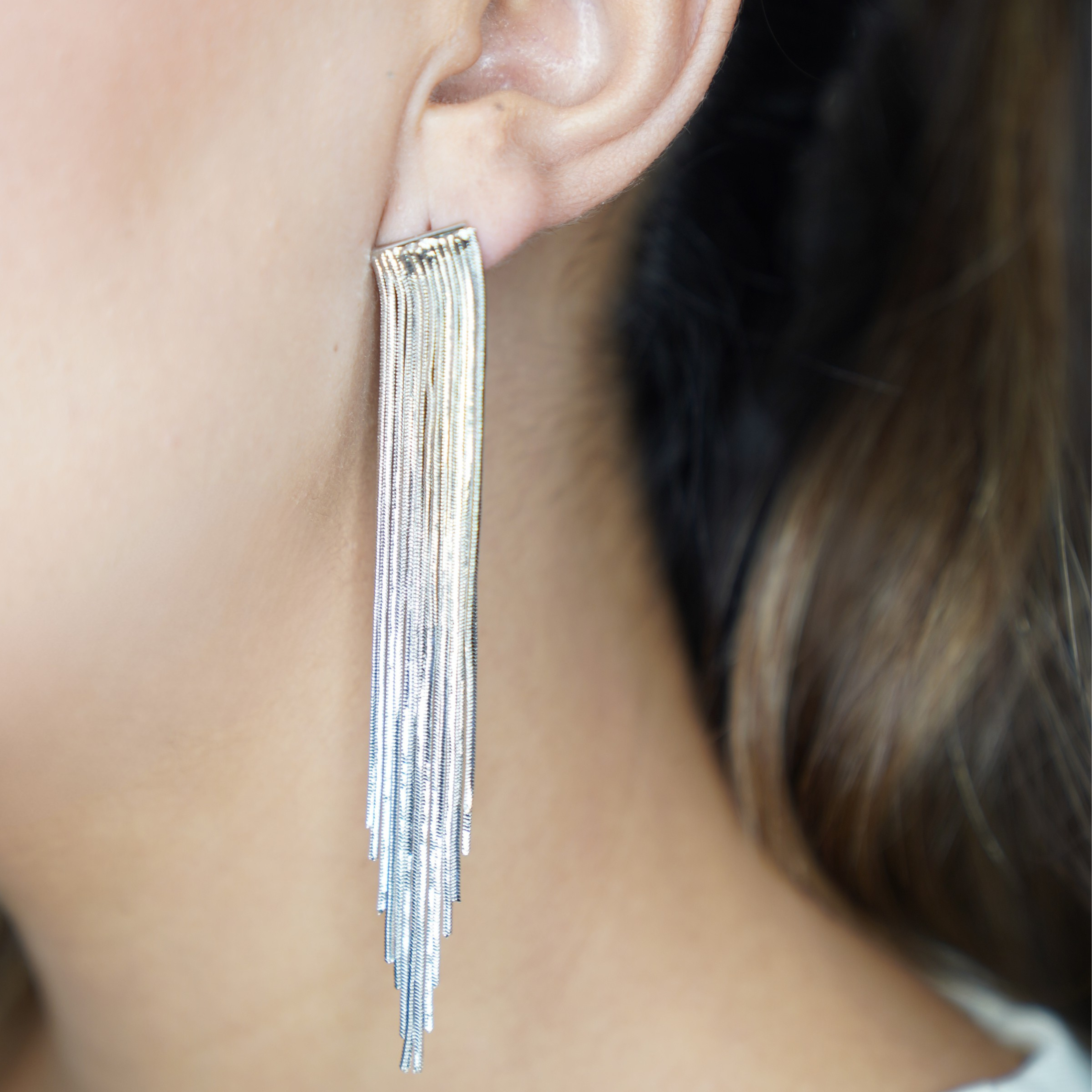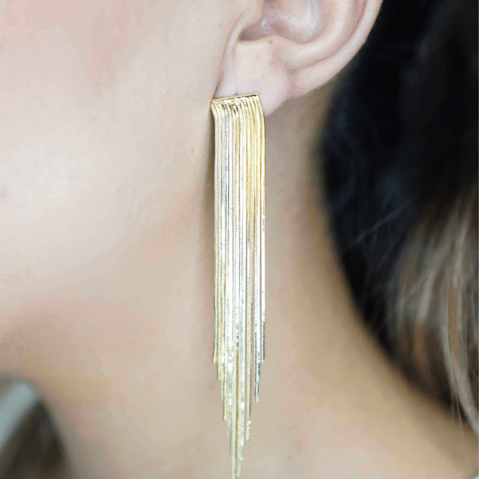 Cadenas metálicas en caída que brillan con movimiento. Disponibles en dorado cálido o plateado brillante, estos aretes livianos y sofisticados elevan cualquier look con un toque de glamour moderno.