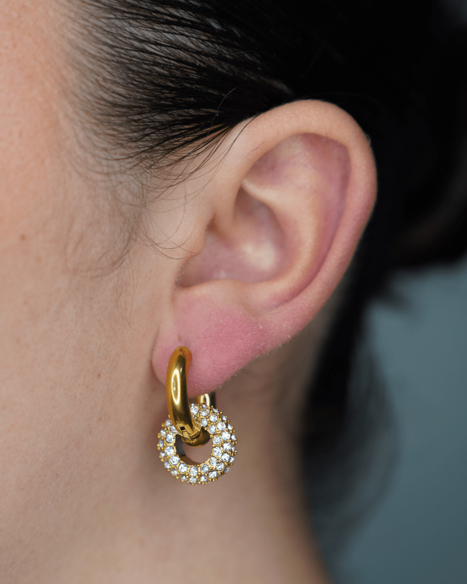 Un clásico con giro moderno. Este arete combina un huggie dorado pulido con un aro colgante de circonias que refleja la luz a cada movimiento. Es ideal para elevar cualquier look con elegancia y brillo sutil.