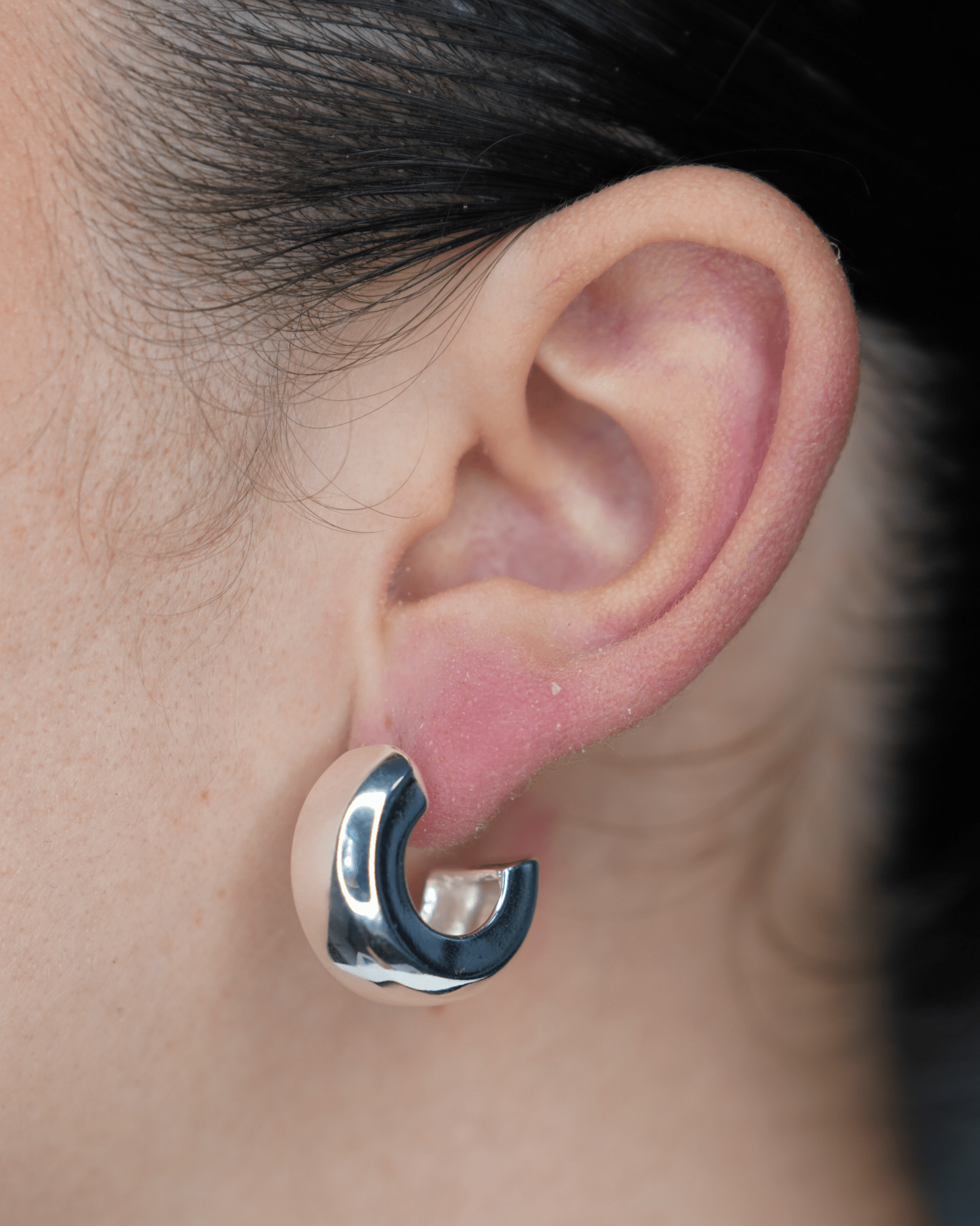 Inspirado en la silueta de una media luna, este arete chunky de acabado espejo dorado y plateado es una pieza statement por sí sola. Elegante y con mucha fuerza visual, perfecto para elevar looks neutros o acompañar un peinado recogido.