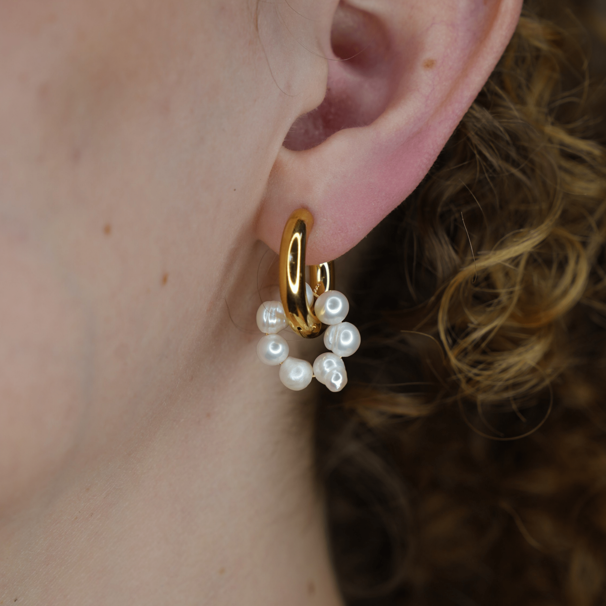 Arete tipo arracada en acero inoxidable, con perlas de río que añaden un toque sofisticado y elegante. Disponible en dorado—un básico con mucha personalidad. ✨
