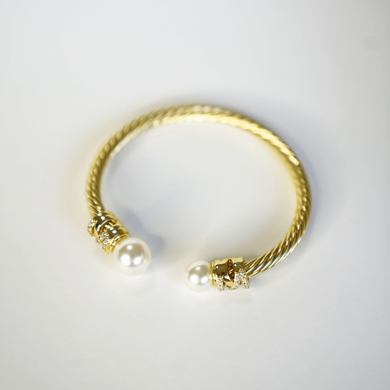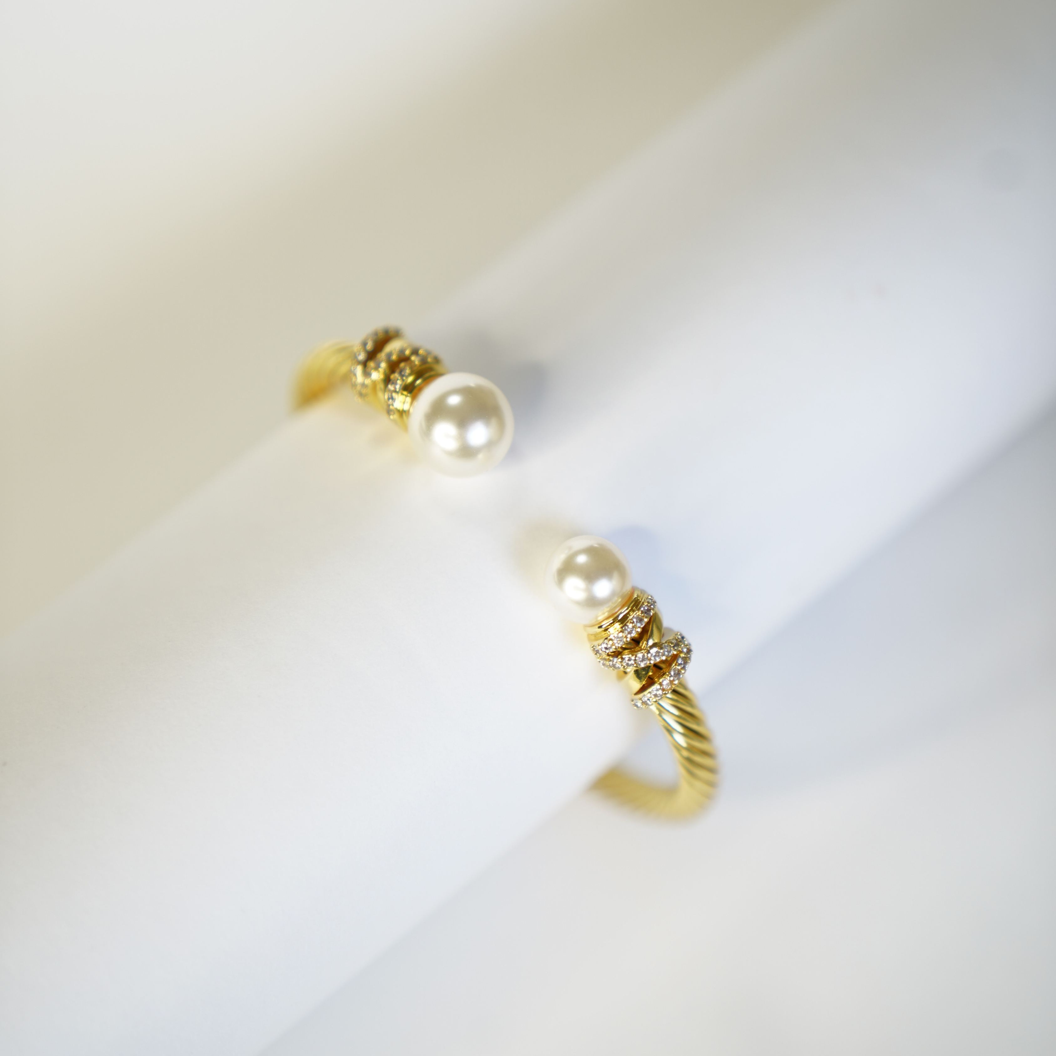 Una joya que fusiona elegancia clásica con detalles modernos. ✨  — Su estructura en acero inoxidable dorado se realza con perlas en cada extremo y delicados acentos de zirconia. Sofisticado, femenino y perfecto para ocasiones especiales.