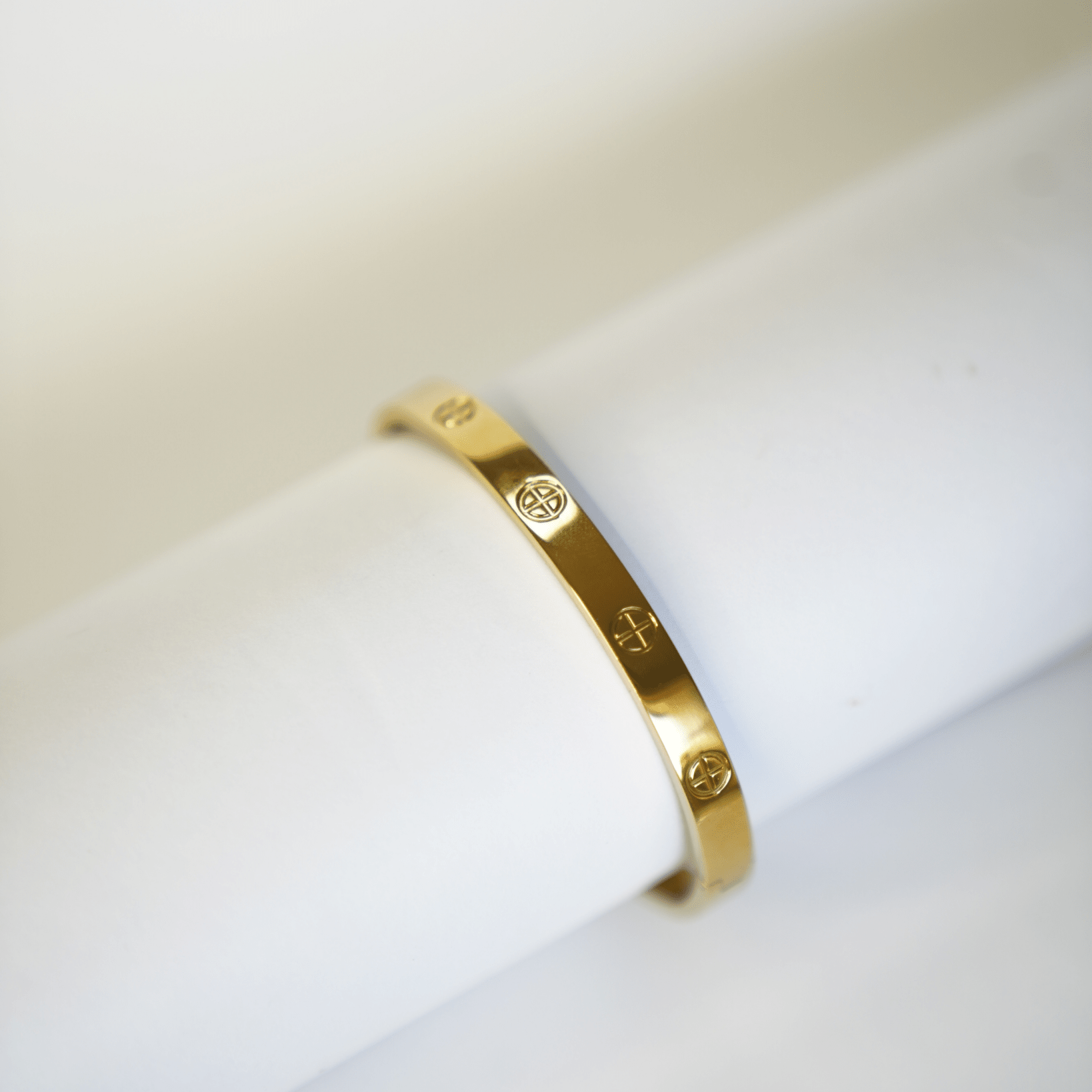 Este brazalete dorado con delicado diseño de acero inoxidable está diseñado para acompañarte todos los días. Resistente al agua y al sudor, combina estilo y durabilidad con un toque de sofisticación minimalista.