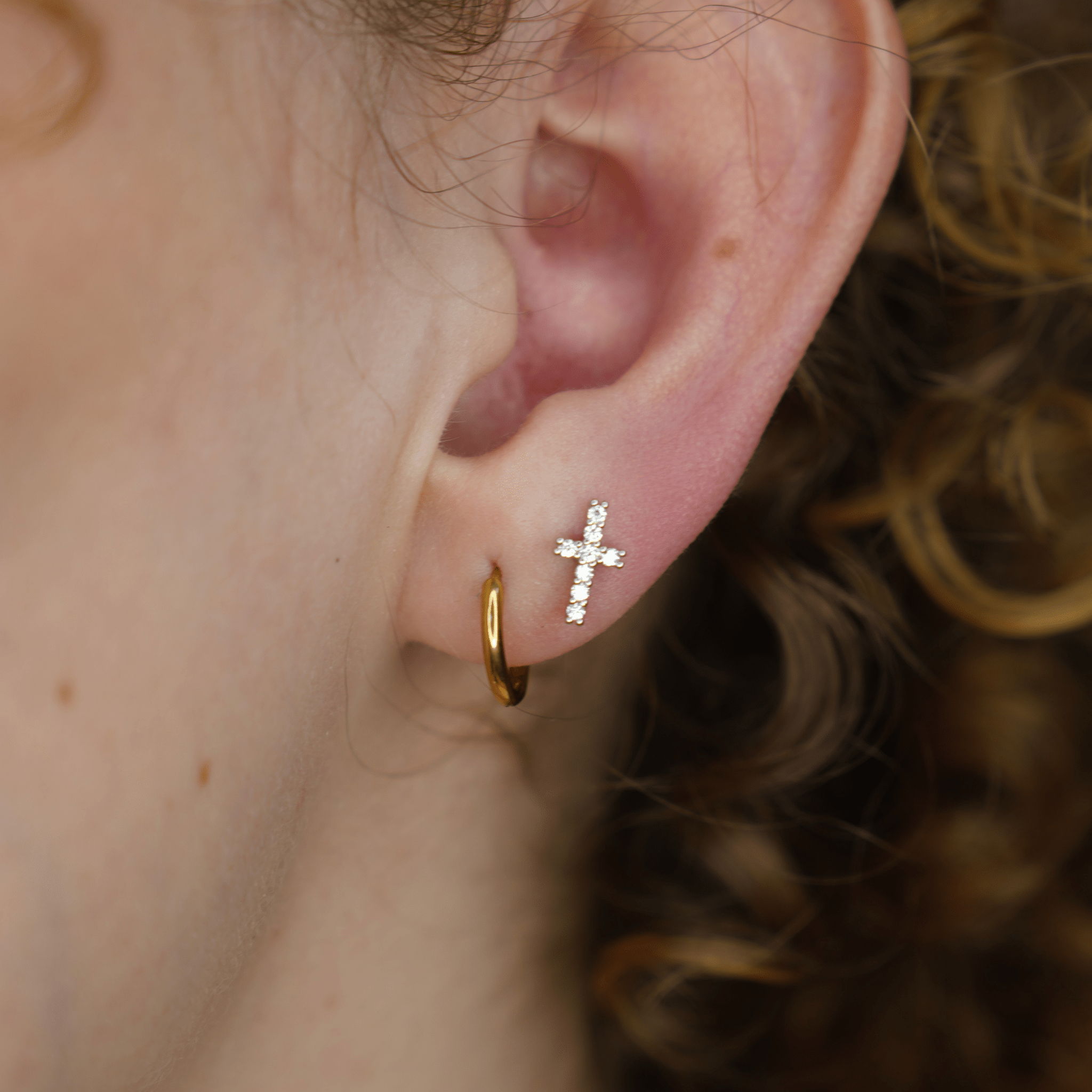 Este broquel con cruz de circonias es resistente al agua y mantiene su brillo impecable, combinando sofisticación y durabilidad. Disponible en dorado y plateado. ✨