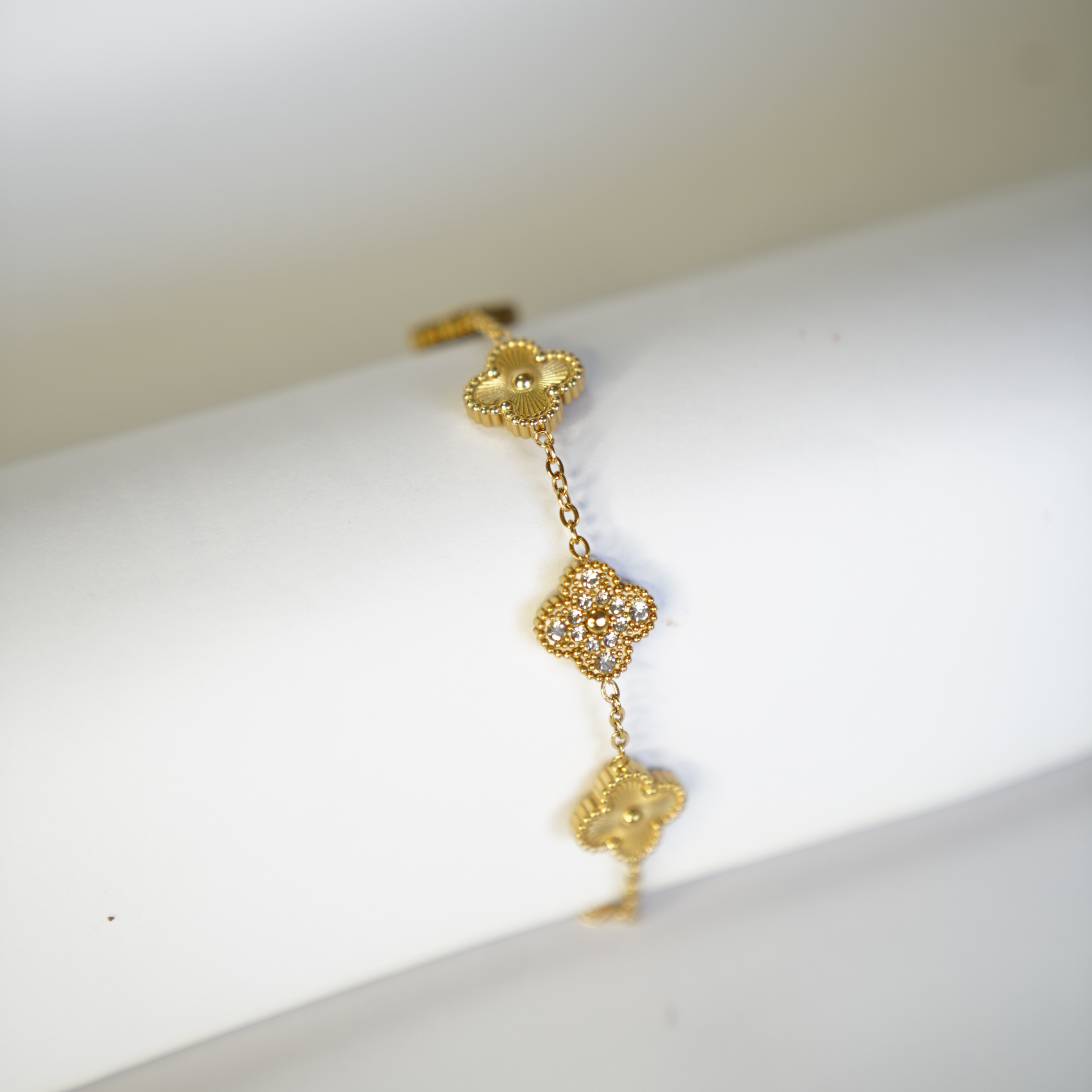 Pulsera de trébol en plateado o dorado, elaborada en acero inoxidable para ofrecerte durabilidad y estilo. Una pieza imprescindible para el día a día.